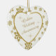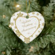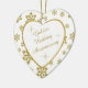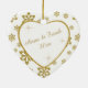 Este é um enfeite elegante para comemorar um casal 50º Aniversário de Casamento, seja no momento da celebração ou do Natal. Ele apresenta um coração branco enquadrado em cintilação falsa dourada em um floco de neve brilhante dourado correspondente em fundo branco. Dentro, o coração branco é o seu texto em dourado correspondente, mais imagens douradas cintilantes. O texto é totalmente personalizável, então você pode fazê-lo dizer o que quiser. Há um campo de texto segundo no verso, que tem a mesma borda dourada do floco de neve e dentro. Este é um presente especial de manutenção da família que será precioso para sempre. *Observe que a imagem está impressa e o ornamento não contém brilho.*