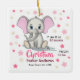 Adorável design de natalidade de menina apresentando um desenho elefante giro com orelhas cor-de-rosa e estrelas em cores escuras e rosas claro e creme. Fácil de personalizar substituindo o nome e os detalhes pelo seu próprio.