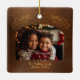 This elegant Christmas ornament has a wide arch photo template, so you can fit a favorite horizontal family photo into a stylish arch shape. Golden branches and leaves bring a special festive touch. Just below the photo, there's a template to customize the ornament with your family name and the year in golden script typography. The brown leather print background brings a hint of luxury.