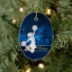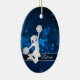 Este adorno elegante apresenta uma silhueta prateada de uma líder de torcida contra um bonito fundo azul com minúsculas luzes estelares. O nome dela está em prata em um banner semitransparente que está emoldurado em cintilação branca. A parte traseira do ornamento tem o mesmo plano de fundo azul com três campos de texto personalizados no centro de um banner de moldagem em losango de falso rico. Perfeito para aquela filha, neta ou sobrinha que está em uma equipe de torcida.