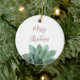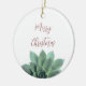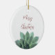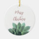 Aproveite este adorno cerâmico suculento de Natal feliz, com um design botânico verde sobre fundo branco. Com a tipografia vermelha escura, você pode personalizar com sua própria mensagem. A parte de trás do ornamento tem uma cor vermelha correspondente. Esta peça elegante faz um presente de na moda para alguém especial ou para adicionar à sua árvore de Natal.