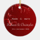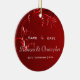 Um vermelho luxuoso salva a data do casamento pendurada no ornamento, com um lindo padrão vermelho, vintage de rolagem e texto personalizado que você pode personalizar com seus próprios detalhes. Por favor, note que este ornamento vermelho de casamento foi criado para combinar com um pacote de convite para casamento de cheio, RSVP, anúncios e muito mais com o mesmo design, que você pode encontrar aqui: https://www.zazzle.com/collections/elegant_red_wedding-119318179366725501