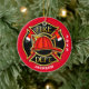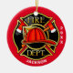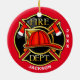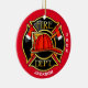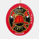 O emblema do corpo de bombeiros está em um fundo vermelho com espaço para seu nome e data.