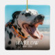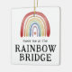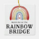 Enfeite natalino de memorial de animal de estimação apresentando de um lado um arco-íris boêmio em aquarela, um coração vermelho, a simpática frase de condolências 'encontre-me na ponte do arco-íris'. No verso está uma foto do seu animal de estimação (cachorro, gato, cavalo, etc.), o nome deles e os anos.