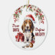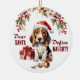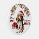 Na frente deste ornamento de Férias está a imagem de um adorável cachorrinho de Basset Hound vestindo um chapéu vermelho e branco de Papai Noel. Ele se senta com um ornamento de árvore quebrada na frente dele. O texto vermelho diz "Caros PAPAIS NOEIS Definem NASCIDOS". No verso, o texto vermelho e verde diz MERRY CHRISTMAS", e há campos de texto adicionais para você personalizar o que quiser. Certifique-se de ver o resto do Cão Basset e outras imagens de raças de cães na Aldeia dos Cachorros.