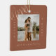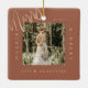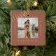 Simples e moderno desenho de fotos para comemorar seu primeiro Natal casado. O design apresenta um simples design com um design de fotos quadrado para mostrar sua foto especial de casamento. "Casado & Feliz", ano e nome do casal exibidos em um simples design moderno ao redor da foto. Dois ornamentos fotográficos com uma foto de um lado e uma segunda foto do outro lado do ornamento.