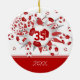 O ornamento de futebol desta menina legal apresenta uma "explosão" de bolas de futebol de tamanho variado que têm painéis vermelhos e brancos, e cinzas e formas de estrelas vermelhas, sobre as quais você pode personalizar seu número de camisola - a estrela vermelha tem um pequeno padrão de bolinhas brancas - personalize o nome do atleta no ano frontal e comemorativo no verso de uma faixa vermelha na borda do ornamento - katz d_zynes