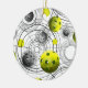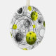 Um adorno divertido com um design moderno de bolas de picles verdes e cinzas sobre um fundo de linhas e círculos de interseção pretos.