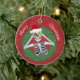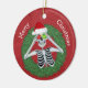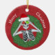 Este ornamento cerâmico pendurado tem um esqueleto engraçado segurando ornamentos com flocos de neve até seus olhos vestindo um chapéu de Papai Noel vermelho dentro uma coroa verde sobre um fundo vermelho profundo. Personalize seu texto no verso com o e o Feliz Natal na frente com os modelos.