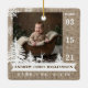 Este Enfeites de natal comemora a chegada do seu novo bebê com um design personalizado com duas fotos — uma na frente e outra no verso. Mostre a sua foto, com a data de nascimento mostrada no lado, e o nome do bebê e o número de natalidade na parte inferior. O ornamento é colocado contra um fundo de textura castanha rústica, enfeitado com flocos de neve brancos, pinheiros, e veados ao longo do fundo para um toque charmoso e festivo. Design por © Moodthology Papery