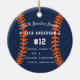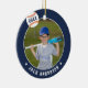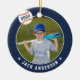 Comemore uma época incrível para seu jogador de beisebol favorito com este ornamento personalizado legal em uma marinho azul e laranja. Personalize a frente com a foto, o nome e o ano do jogador e adicione mais detalhes no verso, incluindo o nome da equipe ou da liga, a estação, a idade, a posição e o nome do treinador.