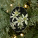 Este ornamento de férias de fotografia de arte apresenta a adorável planta de jardim perene primavera, conhecida como Estrela de Belém (Ornithogalum umbellatum). Cada flor tem seis pétalas brancas e um centro amarelo. As flores estão sobre um fundo escuro, quase preto.