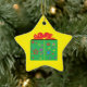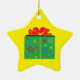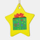 Adicione um splash de cor à sua árvore com um ornamento personalizado, feito de porcelana branca. Este é em forma de estrela com um pacote de presentes no meio, num fundo amarelo brilhante. Você pode design seus próprios ornamentos personalizados de árvores de Natal para crianças, com fotos, um casamento, e você pode design-los com uma mensagem pessoal, de ambos os lados. Cada um tem uma elegante corda de ouro acoplada, fazer fácil de pendurar.