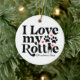 Este adorável ornamento "Eu Amo Meu Rottie" é um ótimo presente para qualquer Mãe ou Pai de cachorro Rottweiler. É personalizável com o(s) nome(s) do seu cão. Esta opção de dois lados tem um modelo de foto no verso para uma foto personalizada.