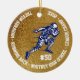 Criar um ornamento personalizado do futebol para seu jogador de equipa favorito da escola. Caracteriza um jogador de futebol running que vai toda a maneira de marc um aterragem! Adicione seu número da equipe dos jogadores, estado do campeonato, ano, nome da escola ou o outro texto personalizado. O fundo do ouro do falso com design branco e azul é perfeito para sua árvore de Natal do feriado.