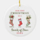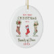 Stockings Family of Three First Christmas Ornament para pais que acabaram de ter seu primeiro filho com mãe, pai e bebê. Nosso primeiro Natal como uma família de três meias de Natal personalizadas mantém o ornamento.