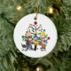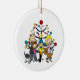 Stick figure family with dad, mom, two children...a boy and a girl, and two family dogs in front of holiday tree.