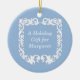 Um ornamento azul de dois lados que apresenta uma argila falsa detalhando em branco nítido. Adicione sua própria mensagem personalizada e faça disso um presente de feriado excelente!