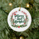 Um adorno cerâmico festivo e fofo, de natal, com tipografia moderna em letras minúsculas, com "Feliz e Brilho" dizendo com um verde botânico floral vermelho e branco