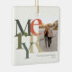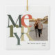 Estes ornamentos de Natal de 2,75" x 2,75" contêm um espaço reservado para sua foto, nome e ano favoritos. As letras na palavra, Feliz são grandes e em cores diferentes de sábio e laranja sobre fundo de marfim. Feita de porcelana branca, cor de Cheio, impressão em cheio, impressão em ambos os lados.