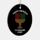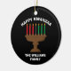 Feliz ornamento de feriado personalizado de Kwanzaa para uma família que apresenta uma cinara em um fundo negro ousado. Personalize com seu nome de família e sua própria mensagem no dentro. As velas cinaras são vermelhas, pretas e verdes como a bandeira africana.