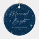 O ornamento de fotos de feriado moderno, com "Casado e Brilho", exibido em um script com letra de mão rodeado por uma borda de estrelas brancas contra um fundo azul-marinho. Personalize a frente do ornamento adicionando seu nome e o ano. A parte de trás do ornamento mostra seu fazer de fotos de casamento... é a perfeita manutenção para seu primeiro Natal como casal casado.
