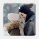 Este ornamento da árvore de Natal oferece uma foto quadrada na frente, realçada com a palavra "alegre" e uma segunda foto no verso. O design apresenta um tema simples, mas elegante, com uma borda branca e texto de script. Personalize com suas fotos favoritas e seus nomes.