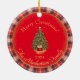 Crie uma exibição de feriado inesquecível com este adorno cerâmico requintado. Este belo ornamento oferece personalização na frente do cheio e é rodeado por um charmoso pano de fundo da xadrez tartana embelezado com detalhes de poeira do ouro. A frente é enfeitada com a mensagem de eterno "Feliz Natal", enquanto a parte de trás mostra uma árvore de Natal de peles verdes e vintage, fornecendo espaço para nomes pessoais ou familiares. O clássico design vermelho e xadrez azul deste ornamento festivo garante um eterno e um apelo persistente, perfeito para o relançamento do espírito de feriado nos próximos anos. Ideal para decoração de árvores de Natal, doação de férias, e guardas queridos. Peça o seu hoje, a tempo das férias!