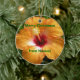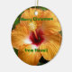 Mele Kalikimaka. Feliz Natal em Haikian. Uma flor tropical brilhante - um belo hibisco vermelho e de cor manga - e um texto personalizável neste ornamento de árvore de Natal de flor havaiana.