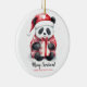 Papais noeis Bons de Panda Feliz Ornamento de Natal. As cores preto, branco e vermelho do estilo Kawaii são um urso panda com chapéu de Papai Noel e um presente. Texto personalizado.