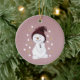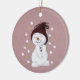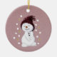 Este primeiro Enfeites de natal rosa apresenta um doce boneco de neve curtindo a neve.