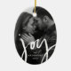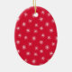 Elegante, ornamento de feriado moderno mostrando sua foto com "alegria" em uma cobertura branca, escrita à mão. Personalize a frente do ornamento adicionando seu nome e o ano. O ornamento se reverte para um padrão de flocos de neve vermelhos e brancos de starburst.