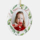 Simples e personalizado, este Red Holly Pattern Christmas Photo Holiday Cerâmica Ornament é o presente perfeito para qualquer membro da família. O texto branco "2018" pode ser alterado para qualquer ano e no verso juntamente com o modelo de fotografia. Apresenta um bago holly com folhagem verde e padrão de ramificações em ambos os lados, um molde fotográfico para personalizar com sua própria foto cercada por uma borda vermelha. Excelente para o primeiro Natal do bebê, acompanhando todos os anos de férias de pais ou vovó e avô.
