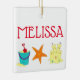 O ornamento apresenta uma ilustração original de um castelo de areia, estrela-do-mar e balas de praia com pá. Apenas personalize com sua informação. Esta design marítima também está disponível em outros produtos. Não vê o que está procurando? Precisa de ajuda para a personalização? Entre em contato com Rebecca para ter algo projetado só para você.
