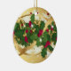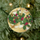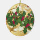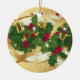 This ornament features a beautiful holiday garland made of lush green holly leaves, bright red berries, sparkling gold accents, and delicate white snowflakes. Flowing golden ribbons weave through the design, adding movement and a warm festive glow. The rich color palette of gold, green, and red gives the ornament a classic Christmas feel while still looking elegant and refined.