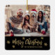 Escrito Elegante moderno Floco de Neve Preto e Dourada Foto Feliz Feriado Feriado de Natal Ornament Cerâmico de Férias Feriado. Recursos um) modelo de foto texto "Feliz Natal". O texto de saudação do "Feliz Natal" é escrito em um belo roteiro de fontes brancas, com letras brancas, e em volta de flocos de neve dourados em fundo preto. Este presente cerâmico de ornamento é bonito para sua família e amigos na época de Natal.