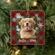 Um Enfeites de natal de cerâmica quadrado decorado com uma xadrez vermelha, verde e branca e flocos de neve brancos em torno de uma moldura para a imagem do seu cão amoroso. Adicione o nome e um ano e crie um belo guardião ou um belo presente.