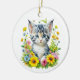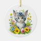 Enfeites de natal personalizado. Ai art retratando um gatinho de cinza listrado, gatinho de gato sentado num bando de flores bonito amarelas, rosa e azuis.