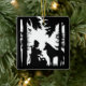 Esse ornamento cerâmico pendurado é preto e branco com uma imagem de silhueta de uma pequena capota vermelha ajoelhada sob árvores na floresta com água pode falar com o lobo. Personalize seu texto em preto com o modelo.