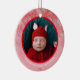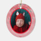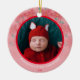 Comemore o primeiro Natal do seu bebê recém-nascido com este elegante ornamento personalizado da poinsettia rosa e verde. Este ornamento é totalmente personalizável! Você pode editar o texto e adicionar sua própria foto clicando em "personalizar esta modelo". Este ornamento de poinsettia de Natal tem um espaço para você adicionar sua foto de bebê, nome de bebê e ano. Apresenta um fundo de padrão de flor de poinsettia rosa e verde, bonito, com um gradiente rosa e uma estrutura redonda vermelha que rodeia a foto do bebê. Esquema clássico de cor rosa e verde excelente para um ornamento de "Primeiro Natal do Bebê" personalizado.
