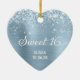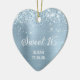 Crie seu próprio adorável ornamento em forma de coração de 16 fotos para sua filha. Você pode personalizar o texto da caligrafia "Sweet 16" ou o estilo da fonte. O fundo da arte digital apresenta um brilho azul sujo e poeirento e uma folha azul clara. Enfeite de 16 anos para ela.