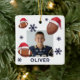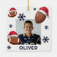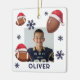 American Football Ball Santa Hat Name Photo Christmas Ceramic Ornament. Fun football ball with a red Santa hat, custom name and a photo. Featuring festive football design wearing Santa hat, these customizable ornament brings sporty cheer to your tree, wrapping, and gift list.