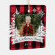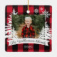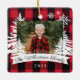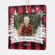 Fazenda rustica, árvore de Natal fresca, com ornamento de manutenção de fotos da família. O ornamento pode ser personalizado com o nome da família, o ano e a foto. Fundo de xadrez de pranchas vermelhas com pinheiros rústicos e flocos de neve. O nome da família é exibido em uma faixa branca. Trabalho de arte por Moodthology Papery.