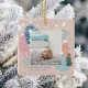 O primeiro enfeite de natal do bebê elegante e bonito. O ornamento da floresta de Natal de uma árvore de Natal é uma fotografia de dois lados, mágica. Design apresenta o nosso pastel chic desenhado à mão colorido das árvores de Natal, flocos de neve brancos em queda e pombos. As cores suaves do pastel evocam uma mensagem de esperança, alegria e paz. O "Primeiro Natal" é colocado sobre o espaço reservado para fotos e personalizado com o ano e o nome do bebê. Toda trabalho de arte é obra de arte original desenhada à mão pela Moodthology Papery.