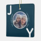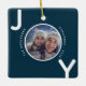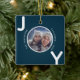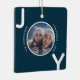 Um Enfeites de natal moderno minimalista em azul e branco. Um fundo azul clássico, com a palavra JOY escrita com letras brancas em negrito. A letra O é usada como quadro fotográfico. Personalize e adicione sua própria foto da família, nome e ano.