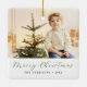 Ornamento moderno e elegante de feriado minimal apresenta uma grande foto de sua escolha, caligrafia "Feliz Natal" em verde pinho festivo com letras serifadas clássicas em preto.