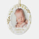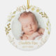Comemore a chegada do seu bebê com este único ornamento de fotos de manutenção. É decorada com folhagem de ouro pintada à mão e bagas. Facilmente personalizável com sua foto, nome e data. Original Watercolor © Michele Davies.