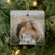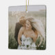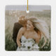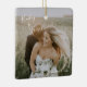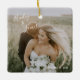 Novo ornamento moderno, com um simples design com os nomes da noiva e do noivo em um elegante roteiro manuscrito no canto superior esquerdo e a data do casamento no canto inferior direito, sobre sua foto favorita do casamento. Você pode adicionar a mesma foto a ambos os lados ou a outra em cada lado. A letra chic da mão adiciona um toque romântico. Este ornamento faz um presente de excelente para um casal recém-casado para o seu primeiro Natal casado.