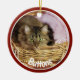 Enfeites de natal fotográfico feito em forma redonda, cerâmica, com gráficos vermelhos, foto personalizada, na frente com texto branco. O verso é feito em vermelho, verde e branco com texto gráfico lendo Feliz Natal e um ano personalizado sua personalização. Adicione a foto, o nome e o ano de um ornamento de feriado de excelente para lembrar seu animal de estimação.