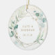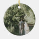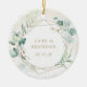 Um ornamento cerâmico moderno e elegante, com os seus nomes e dentro de data de casamento, de uma estrutura geométrica de ouro falsa cercada por folhas verdes de eucalipto e verde, com uma dica de azul, sobre uma lavagem a aquarela pastel com manchas de ouro falso. A parte de trás tem sua foto favorita de casamento. Este ornamento botânico rústico também faz um presente de excelente para um casal recém-casado para o seu primeiro Natal.